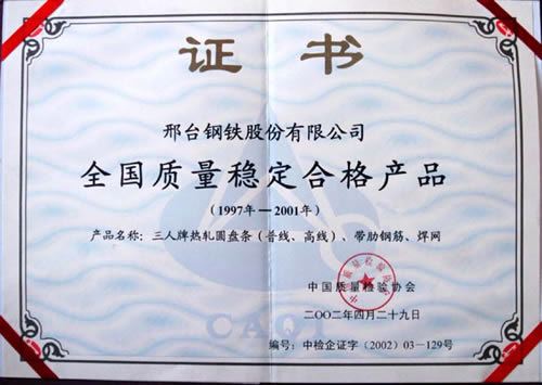 三人牌熱軋圓盤條、帶肋鋼筋、焊網獲全國質量穩(wěn)定合格產品