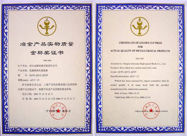 低碳鋼熱軋圓盤條Q195,Q215,Q235獲冶金產品實物質量金杯獎