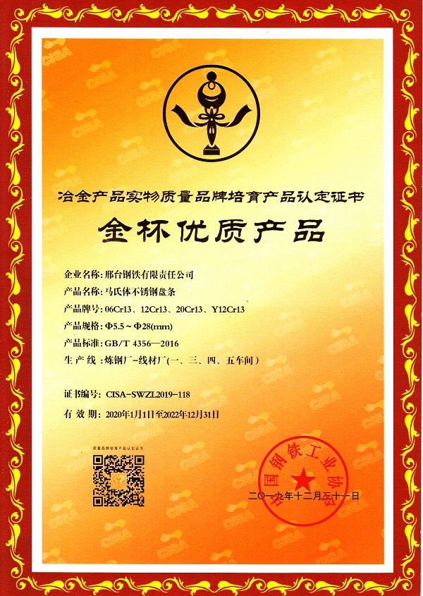 邢鋼馬氏體不銹鋼盤條06Cr13、12Cr13、20Cr13、Y12Cr13 φ5.5-28mm規(guī)格獲冶金產(chǎn)品實(shí)物質(zhì)量金杯優(yōu)質(zhì)產(chǎn)品認(rèn)定證書