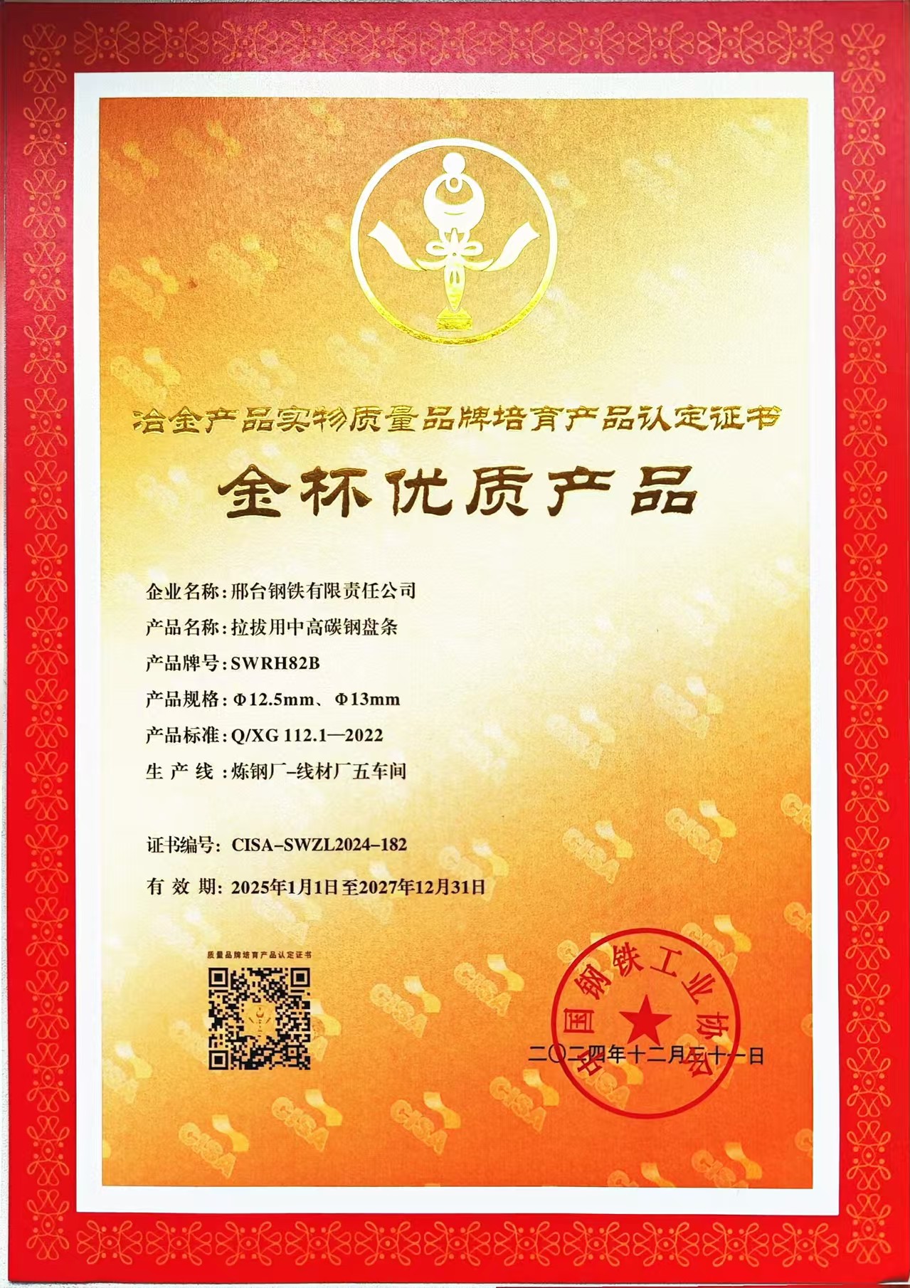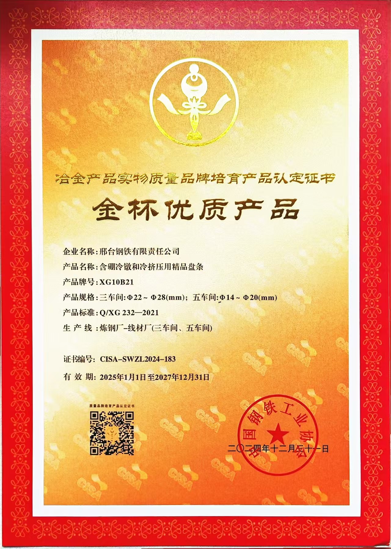 2024年公司含硼冷鐓及冷擠壓用精品盤條XG10B21產(chǎn)品獲得冶金產(chǎn)品實物質(zhì)量品牌培育產(chǎn)品(金杯優(yōu)質(zhì)產(chǎn)品)認定證書,簡稱金杯獎。“冶金產(chǎn)品實物質(zhì)量品牌培育”評選活動于24年3月啟動,由中國鋼鐵工業(yè)協(xié)會主辦,金杯獎是中國鋼鐵工業(yè)協(xié)會組織的冶金行業(yè)唯一的比較權威的獎項,