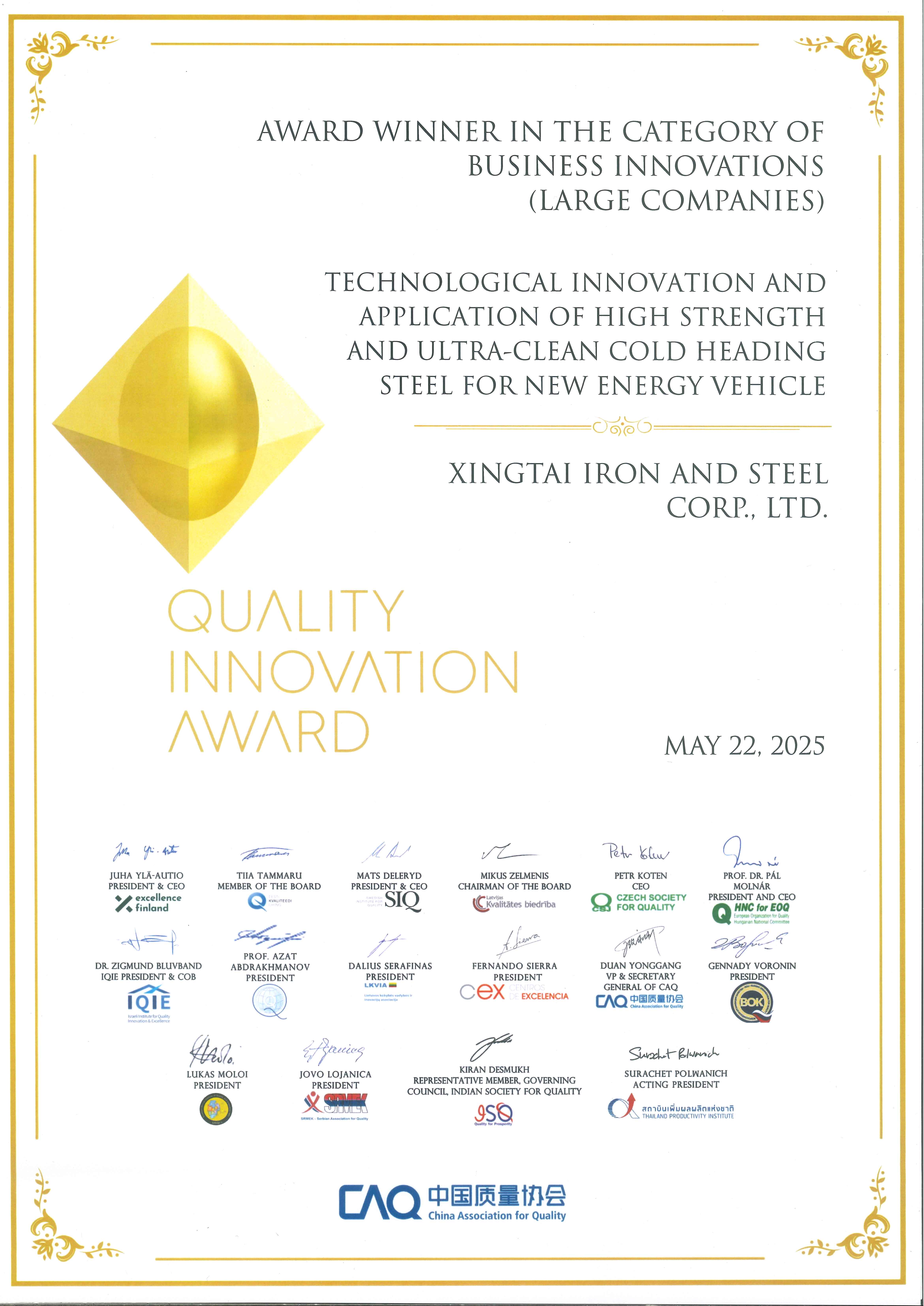2025.5.22-23邢臺鋼鐵有限責任公司參加了在泰國舉辦的2024年國際質(zhì)量創(chuàng)新大賽發(fā)布會暨頒獎儀式,邢臺鋼鐵發(fā)布的項目《新能源汽車用高強度超高潔凈度冷鐓鋼技術創(chuàng)新及應用》榮獲該大賽一等獎。這是邢鋼歷史上獲得的首個國際大獎,也是自國際質(zhì)量創(chuàng)新大賽舉辦以來,在鋼鐵領域首次獲得的國際大獎。
