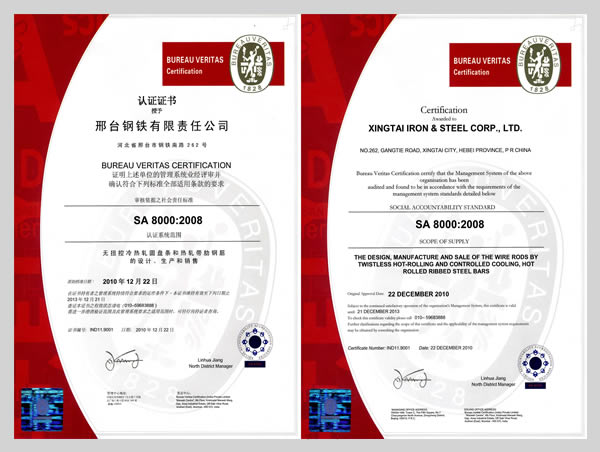 2010年12月22日,邢鋼在全國鋼鐵行業(yè)中首家通過SA8000社會責(zé)任體系認(rèn)證。