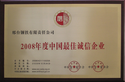 2008年12月,邢鋼榮獲由中國企業(yè)聯(lián)合會(huì)、中國企業(yè)家協(xié)會(huì)頒發(fā)的2008年度“中國最佳誠信企業(yè)”榮譽(yù)稱號。