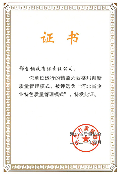 2021年4月,由河北省質量協(xié)會評選的首批“河北省企業(yè)特色質量管理模式”名單揭曉。邢鋼申報的“精益六西格瑪創(chuàng)新管理模式”,憑借理念先進、方法科學、措施易行、效果明顯等優(yōu)勢上榜首批名單。