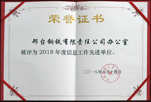 2018年3月15日,邢鋼(主要產(chǎn)品:三人牌純鐵、碳鋼、不銹鋼、軸承鋼系列盤條和熱軋帶肋鋼筋),被中國質(zhì)量檢驗協(xié)會授予“全國產(chǎn)品和服務(wù)質(zhì)量誠信示范企業(yè)”稱號。