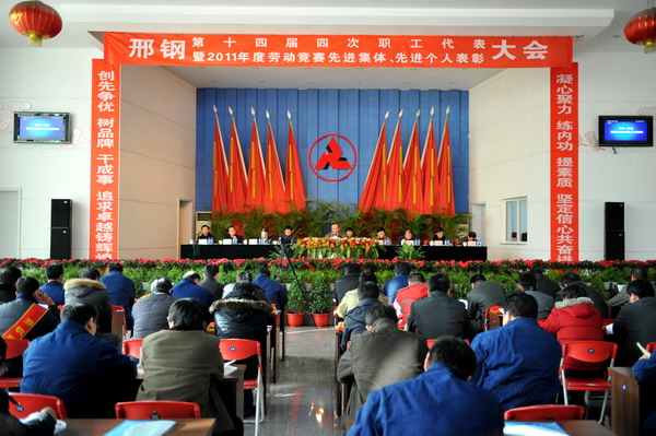 - 1月4日上午八時(shí),公司會(huì)議中心花團(tuán)錦簇,現(xiàn)場(chǎng)氣氛莊重?zé)崃?,在莊嚴(yán)的國(guó)歌聲中,公司第十四屆四次職工代表大會(huì)暨2011年度勞動(dòng)競(jìng)賽先進(jìn)集體、先進(jìn)個(gè)人表彰會(huì)隆重召開(kāi)。公司領(lǐng)導(dǎo)袁世臻、王春雨、張永藏、苑?,F(xiàn)、梁鋒、戴鶴祥、劉蘭宗、孔俊其、周兵晨、李喜山出席了會(huì)議。邢臺(tái)市總工會(huì)副主席宋起香應(yīng)邀到會(huì)并致詞。