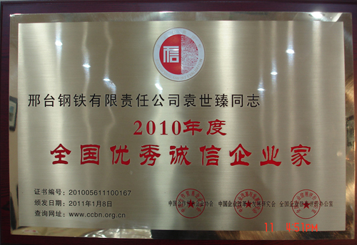 日前,在由中國合作貿易企業(yè)協(xié)會、中國企業(yè)改革與發(fā)展研究會、全國企業(yè)信用評價辦公室組織召開的中國企業(yè)科學發(fā)展論壇暨誠信表彰大會上,邢鋼被評為2010年度“中國AAA級信用企業(yè)”、公司榮獲“全國文明誠信示范單位” 稱號、董事長、總經理袁世臻榮獲“全國優(yōu)秀誠信企業(yè)家” 稱號。