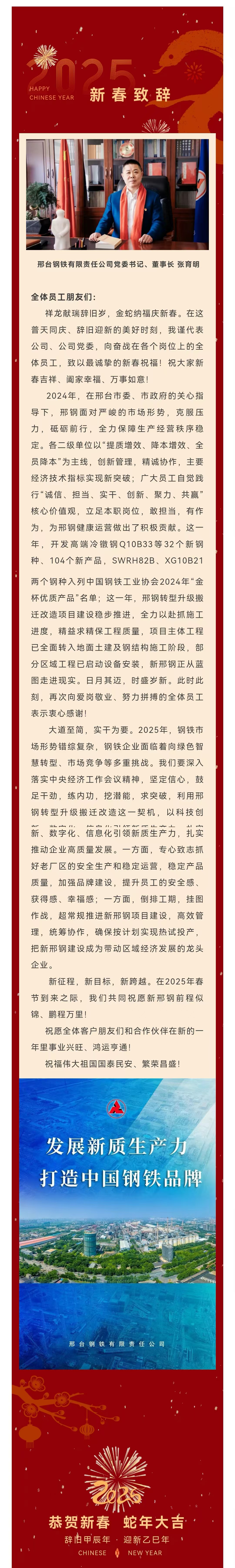 祥龍獻瑞辭舊歲,金蛇納福慶新春。在這普天同慶、辭舊迎新的美好時刻,我謹代表公司、公司黨委,向奮戰(zhàn)在各個崗位上的全體員工,致以最誠摯的新春祝福!祝大家新春吉祥、闔家幸福、萬事如意!