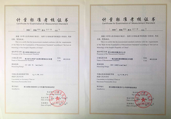 近日獲悉,邢鋼兩項企業(yè)最高計量標準《一氧化碳檢測報警器檢定裝置》和《氧分析儀和氧氣檢測報警器檢定裝置》獲得由邢臺市行政審批局頒發(fā)的《計量標準考核證書》。截至目前,邢鋼最高計量標準由15項增到17項,專業(yè)范圍由5類增加到6類。