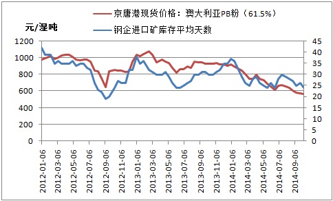 圖三:鋼企進(jìn)口礦庫(kù)存天數(shù)與京唐港澳粉價(jià)格走勢(shì)