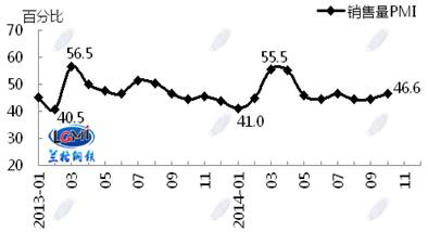 =鋼鐵市場活躍度略有好轉(zhuǎn)。10月銷售量指數(shù)為46.6%,較上月上升2.1個百分點(見圖3),表明10月份鋼貿(mào)企業(yè)銷售量增加,鋼鐵流通市場活躍度略有好轉(zhuǎn)。進入10月,隨著鋼鐵原料鐵礦石及鋼坯價格的先漲后跌,鋼材市場價格也呈現(xiàn)先漲后跌走勢,市場成交總體有所好轉(zhuǎn)。從區(qū)域看,六大區(qū)域銷售量指數(shù)除東北、西北地區(qū)有所下降外,其余地區(qū)均出現(xiàn)不同程度的回升。