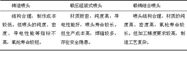 因為拉瓦爾孔型具有比較高的射流速度,所以氧槍噴頭一般都采用拉瓦爾孔型。為了便于制作擴張段,均簡化為圓錐形。在最近幾年的不斷進化中,甚至還出現(xiàn)了“突擴”、“旋轉(zhuǎn)”等特殊孔型。按氧槍噴頭的制造方法,氧槍可分為鑄造噴頭、鍛壓組裝式噴頭及鍛鑄結(jié)合噴頭,三種噴頭特點下表所示。