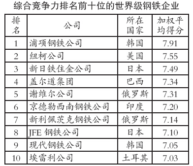 浦項鋼鐵公司在技術工人熟練程度、技術創(chuàng)新能力、聯(lián)盟與合資、所在國家風險等方面獲得10分的滿分,但在獲取鐵礦石、煉焦煤等煉鋼原料和能源成本、國內(nèi)市場趨于飽和等方面存在明顯短板,得分也相對較低,該公司以加權平均7.91分(滿分為10分)繼續(xù)位居榜首,與去年得分相比沒有變化。