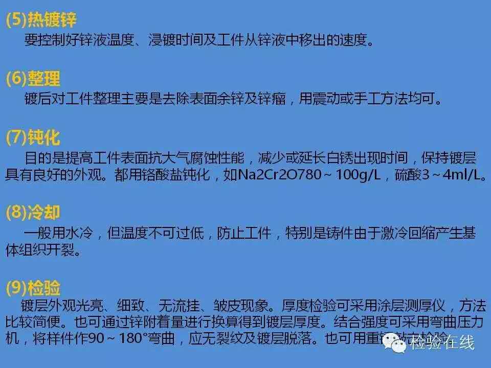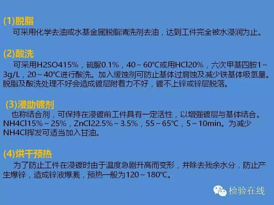 工件→脫脂→水洗→酸洗→水洗→浸助鍍?nèi)軇?rarr;烘干預(yù)熱→熱鍍鋅→整理→冷卻→鈍化→漂洗→干燥→檢驗