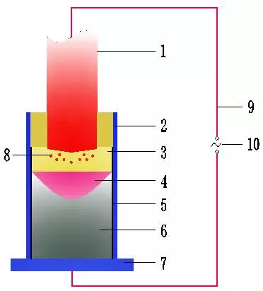 1-自耗電極;2-水冷結(jié)晶器;3-渣池;4-金屬熔池;5-渣殼;6-鋼錠;7-底水箱;8-金屬熔滴;9-變壓器;10-大電流導(dǎo)體