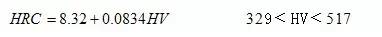 此公式用我國公布的黑色金屬硬度標準數(shù)據(jù)進行換算,其HRC誤差基本上在?0.4HRC 范圍內(nèi),其最大誤差也僅士0.9HRC,計算的HV誤差最大為?15HV。