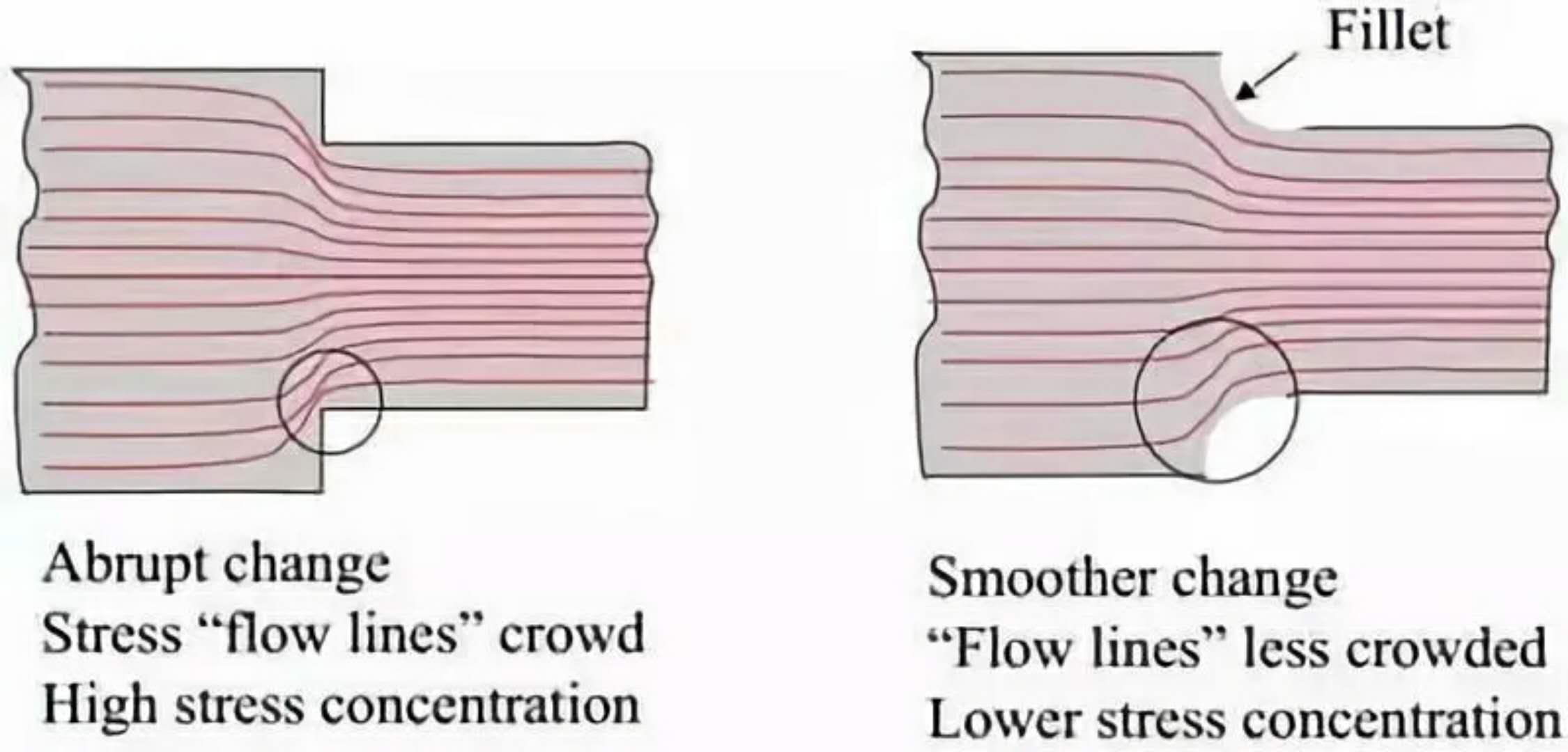 實(shí)際上,所有的疲勞失效都發(fā)生在應(yīng)力集中點(diǎn)或應(yīng)力集中處的零件的外表面上。例如,凹槽、圓角、孔、螺紋、鍵槽、花鍵、焊縫等。如果該部件提供長期無故障的服務(wù),設(shè)計者必須考慮到這些應(yīng)力提升器的影響。應(yīng)力集中的作用直接與其半徑小有關(guān)。與先前提到的促進(jìn)疲勞失效的微裂紋一樣,應(yīng)力發(fā)生位置的半徑越小,產(chǎn)生的應(yīng)力越集中越大。有趣的是,應(yīng)力集中對高延展性的金屬影響很小。其解釋是,由幾何變化引起的應(yīng)力集中被限制在屈服應(yīng)力,止于塑性變形。