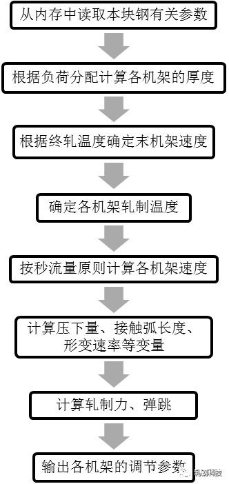 圖1所示為精軋設定模型計算原理圖的主要思路,不代表編寫程序所用的細框圖,因此只是展現了大概的計算流程,看圖可以初步了解精軋設定模型的大致控制思路。