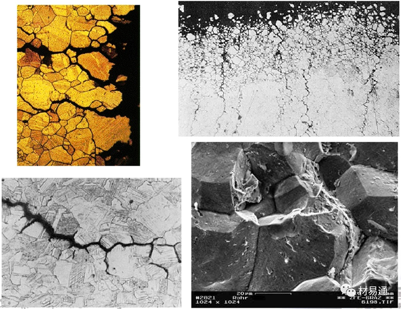SCC裂紋分為三種:晶間型、穿晶型、混合型。晶間型:裂紋沿晶界擴(kuò)展,如軟鋼、鋁合金、銅合金、鎳合金;穿晶型:裂紋穿越晶粒擴(kuò)展,如奧氏體不銹鋼、鎂合金;混合型:鈦合金。