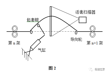 活套是用來檢測(cè)和調(diào)節(jié)相鄰機(jī)架間速度關(guān)系從而實(shí)現(xiàn)無(wú)張力軋制的設(shè)備?;钐字饕苫钐讙呙杵?、起套輥及其調(diào)節(jié)器等組成,結(jié)構(gòu)如(圖2)所示。主要作用是根據(jù)檢測(cè)的套位信號(hào)來控制上游軋機(jī)的速度,實(shí)現(xiàn)自動(dòng)控制系統(tǒng)。
