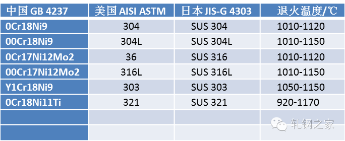 表 1:奧氏體不銹鋼參考退火溫度
