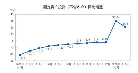 2021年1-3月份,全國固定資產投資(不含農戶)95994億元,同比增長25.6%;比2019年1-3月份增長6.0%,兩年平均增長2.9%;經季節(jié)調整后與去年10—12月份環(huán)比增長2.06%。其中,民間固定資產投資55022億元,同比增長26.0%。從環(huán)比看,3月份固定資產投資(不含農戶)增長1.51%。