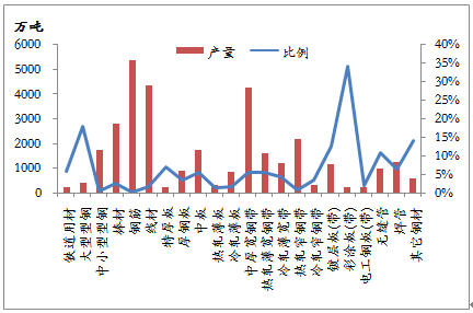 1-5月份,我國共出口鋼材1791.7萬噸,棒線材、角型材、板材、鋼管、鐵道用材和其它用材分別占11.4%、5.9%、60.1%、15.4%、1.0%和6.2%,板材所占份額最大,棒線材和鋼管次之。就前5個月出口量而言,退稅取消的鋼材品種出口數(shù)量為703.3萬噸,占1-5月份鋼材出口總量的39.3%。雖然鋼材總出口量只占到國內產量的5.1%,但仍有部分品種出口占產量的比例較大,對出口具有一定依賴性。鍍鋅板、熱軋板卷、中厚板和大型型鋼的出口數(shù)量占產量的比例較大,在出口稅率下調的情況下,國內資源供應的壓力將會明顯增大,從而影響到國內價格的運行。不過,在政策執(zhí)行日期之前,出口企業(yè)必定要加緊落實前期簽訂的合同,熱軋卷等品種的出口可能會加大,對國內鋼材市場將是利好。