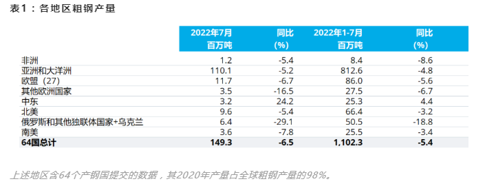 2022年7月全球64個納入世界鋼鐵協(xié)會統(tǒng)計國家的粗鋼產量為1.493億噸,同比下降6.5%。
