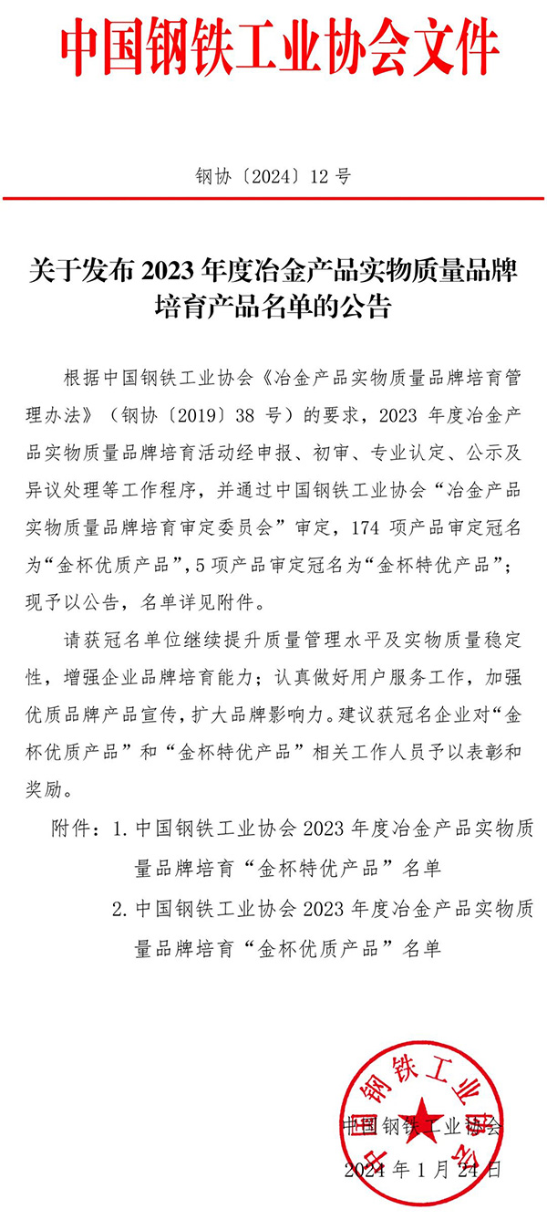 2024年1月24日,中國鋼鐵工業(yè)協(xié)會發(fā)布2023年度冶金產(chǎn)品實物質(zhì)量品牌培育產(chǎn)品名單公告,邢臺鋼鐵申報的《冷鐓和冷擠壓用熱軋盤條ML08Al》和《冷鐓和冷擠壓用熱軋盤條ML20MnTiB》獲冶金產(chǎn)品實物質(zhì)量品牌培育“金杯優(yōu)質(zhì)產(chǎn)品”。 至此,在合金冷墩鋼、簾線鋼、軸承鋼、焊接用鋼、預(yù)應(yīng)力、易切削鋼、耐候鋼種等應(yīng)用領(lǐng)域,邢鋼共有近50個產(chǎn)品獲此殊榮,這標(biāo)志著公司高端鋼種產(chǎn)品實物質(zhì)量達到了國際同類產(chǎn)品實物水平。