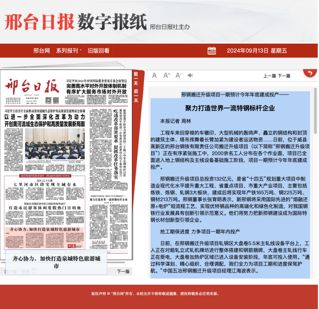 市委、市政府成立支持幫扶邢鋼搬遷升級(jí)項(xiàng)目的協(xié)調(diào)督導(dǎo)工作組,協(xié)調(diào)推進(jìn)項(xiàng)目建設(shè),為轉(zhuǎn)型升級(jí)搬遷改造創(chuàng)造良好環(huán)境。