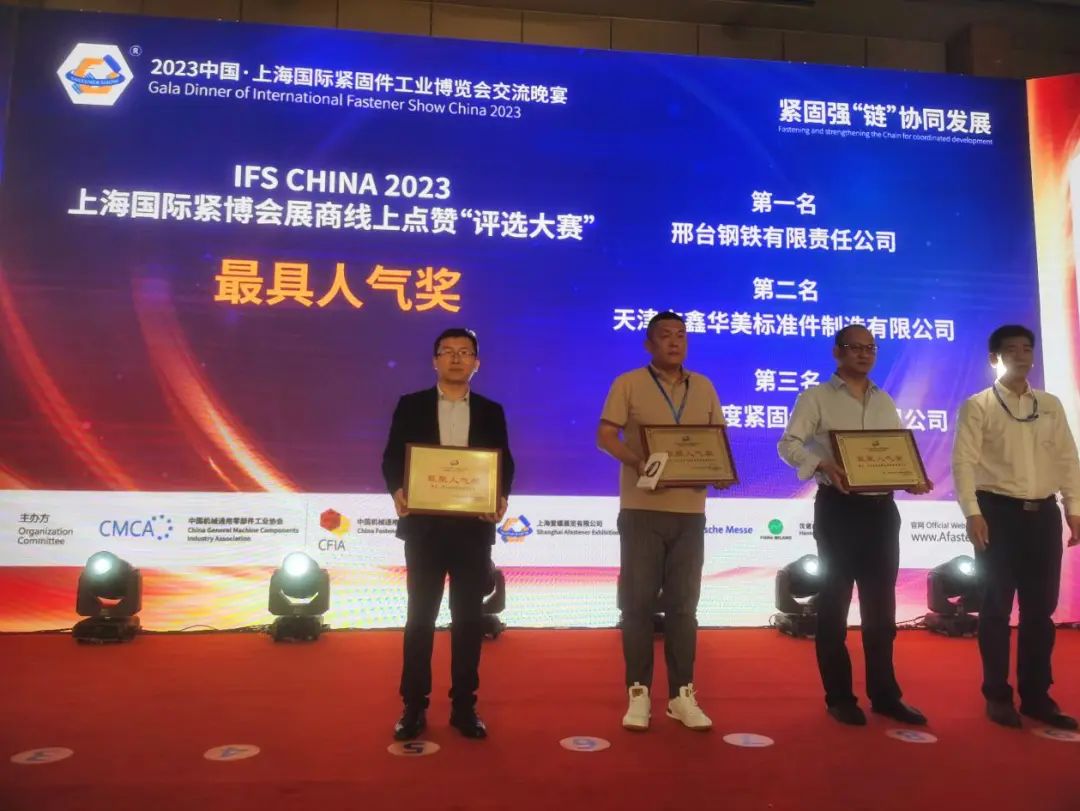 5月22日獲悉,在2023中國(guó)上海國(guó)際緊固件工業(yè)博覽會(huì)上,邢臺(tái)鋼鐵有限責(zé)任公司榮獲IFS CHINA 2023 上海國(guó)際緊博會(huì)展商線上點(diǎn)贊“評(píng)選大賽”第一名,獲得“最具人氣獎(jiǎng)”獎(jiǎng)項(xiàng),并被授予獎(jiǎng)杯及證書。
